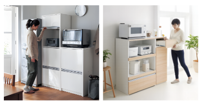 👉 扉付き収納 or 家電収納ユニットに入れるだけで印象が激変します。