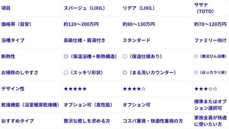 1日の疲れを癒す時間は、やっぱりお風呂ですよね。泉州リノベーションでは、デザイン・機能・快適さを兼ね備えた3つの人気浴槽「スパージュ」「リデア」「サザナ」をおすすめしています。それぞれの特徴や価格を比較。実際に多くのお客様から喜ばれているポイントも交えて、理想のバスルーム選びをサポートします🛀